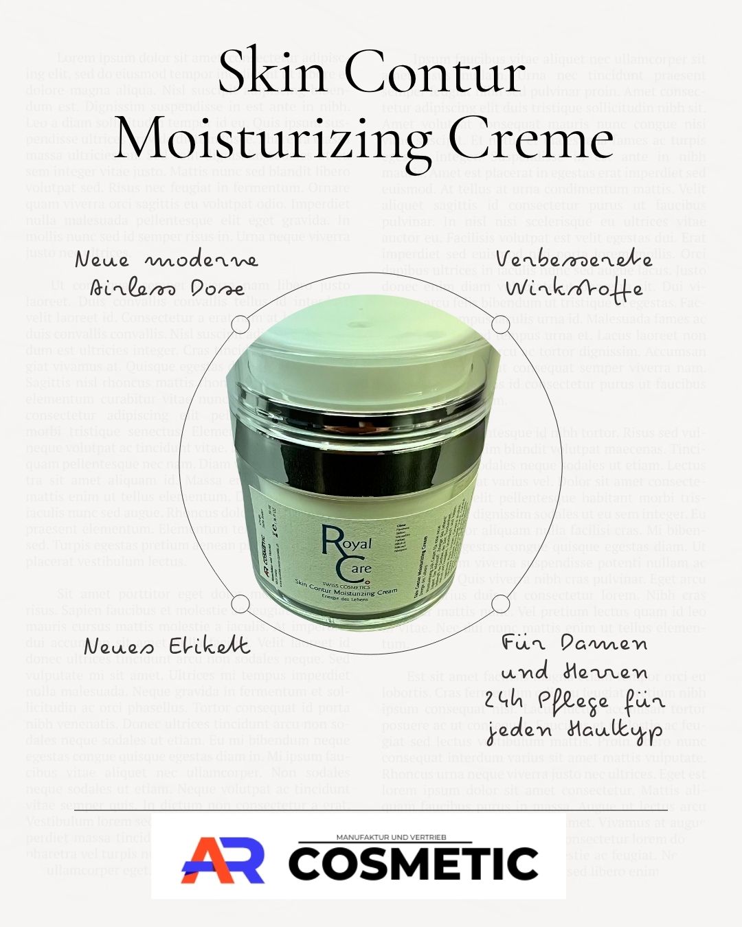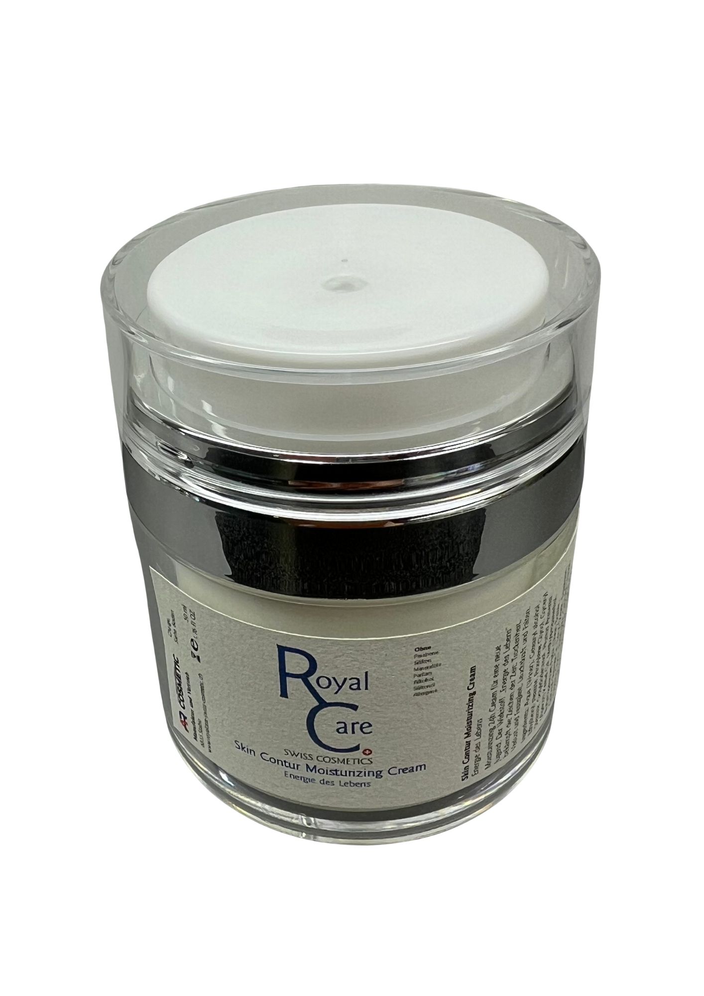 Mit der Skin Contur Creme von Royal Care Swiss Cosmetic ist uns eine einzigartige Luxus-Wirk-Komposition gelungen, die den Zellschutz der Haut, deren Entgiftung und Reparatur und damit die Langlebigkeit der Hautzellen zu verbessern hilft. Die exquisite Formulierung enthält den Wirkstoff „Energie des Lebens“ und ist wie eine Frischekur und Jungbrunnen für jugendlich samtig, weiche Haut. Proteinhydrolysat, Chondroitin und ein Biokatalysator Adenosine Triphosphate (ATP) bilden ein Konzept um den Alterungsprozess im Hautbindegewebe zu verzögern. Hochmolekulare und niedermolekulare Hyaluronsäure durchfeuchtet die Haut nicht nur, sondern speichert die Feuchtigkeit über einen längeren Zeitraum. Der hochkonzentrierte und in seiner Art einzigartige Age-Defense-Wirkkomplex enthält Niacinamid, Vitamin E, Phytosterole, ein Spezial-Peptid, einen Hyaluron-Feuchtigkeitsfaktor, sowie pflegende Öle für ein Optimum an Schutz, Reparatur und Pflege der Haut.